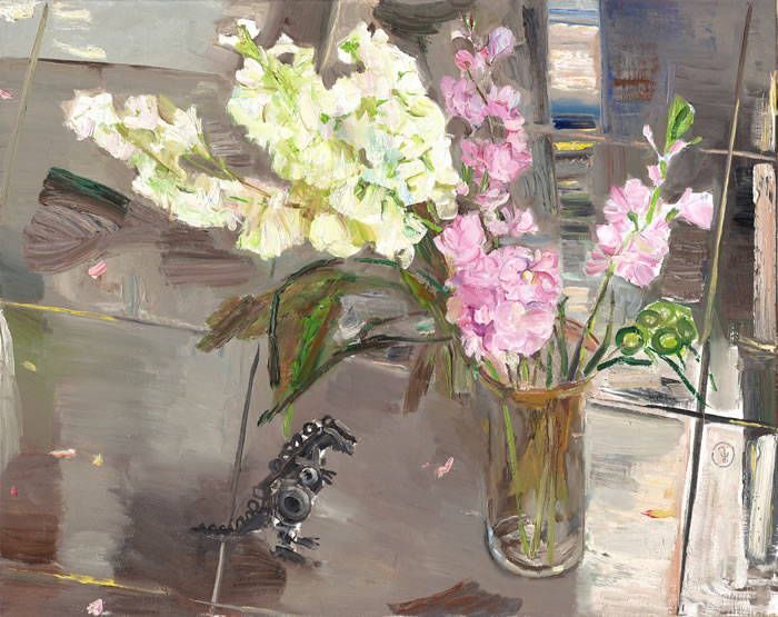 更值得一提的是,我们在戴先生的作品中,总能看到他像孩子一样不断探索、求变的好奇和“好玩”之心。或是大胆的将画面简化成色块结构,或是在传统静物旁加上一个童趣的小恐龙,或是那一把充满烟火气的秋菠菜,又或是老玉米里那灿然的几穗儿玉米须……戴士和始终在突破自己既有的语言符号,在画面的发展中记录着真实而鲜活变化着的自己。