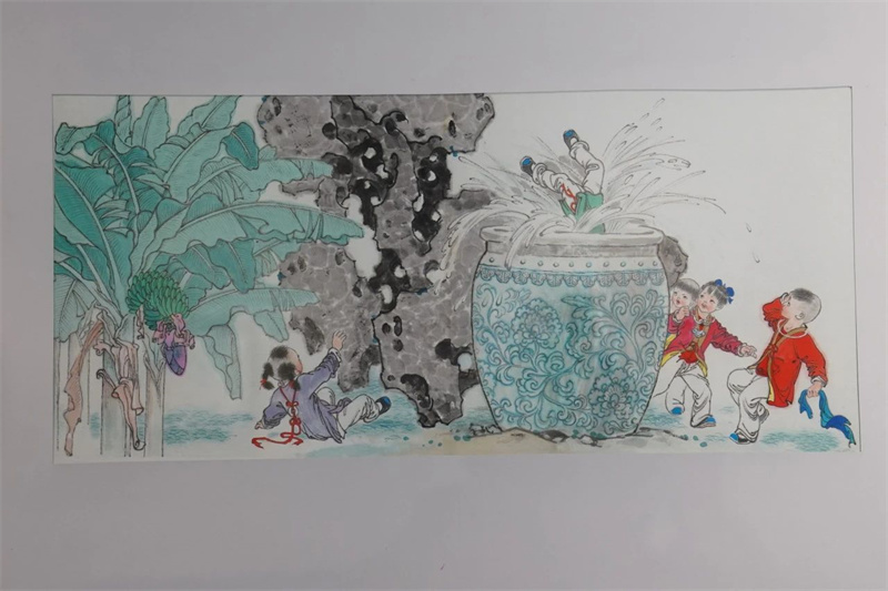 杨永青的连环画作品以其独特的艺术视角和精湛的技法而著称。他善于运用细腻的笔触和丰富的色彩,将故事中的人物形象和场景描绘得栩栩如生。在展览的“英雄少年”主题展区,展出了《王二小》《刘胡兰》《龙梅玉荣》《刘文学》等红色经典作品;“中华美少年”主题展区则展出《孔融》《曹冲》《沈约》等历史人物故事。